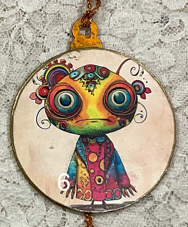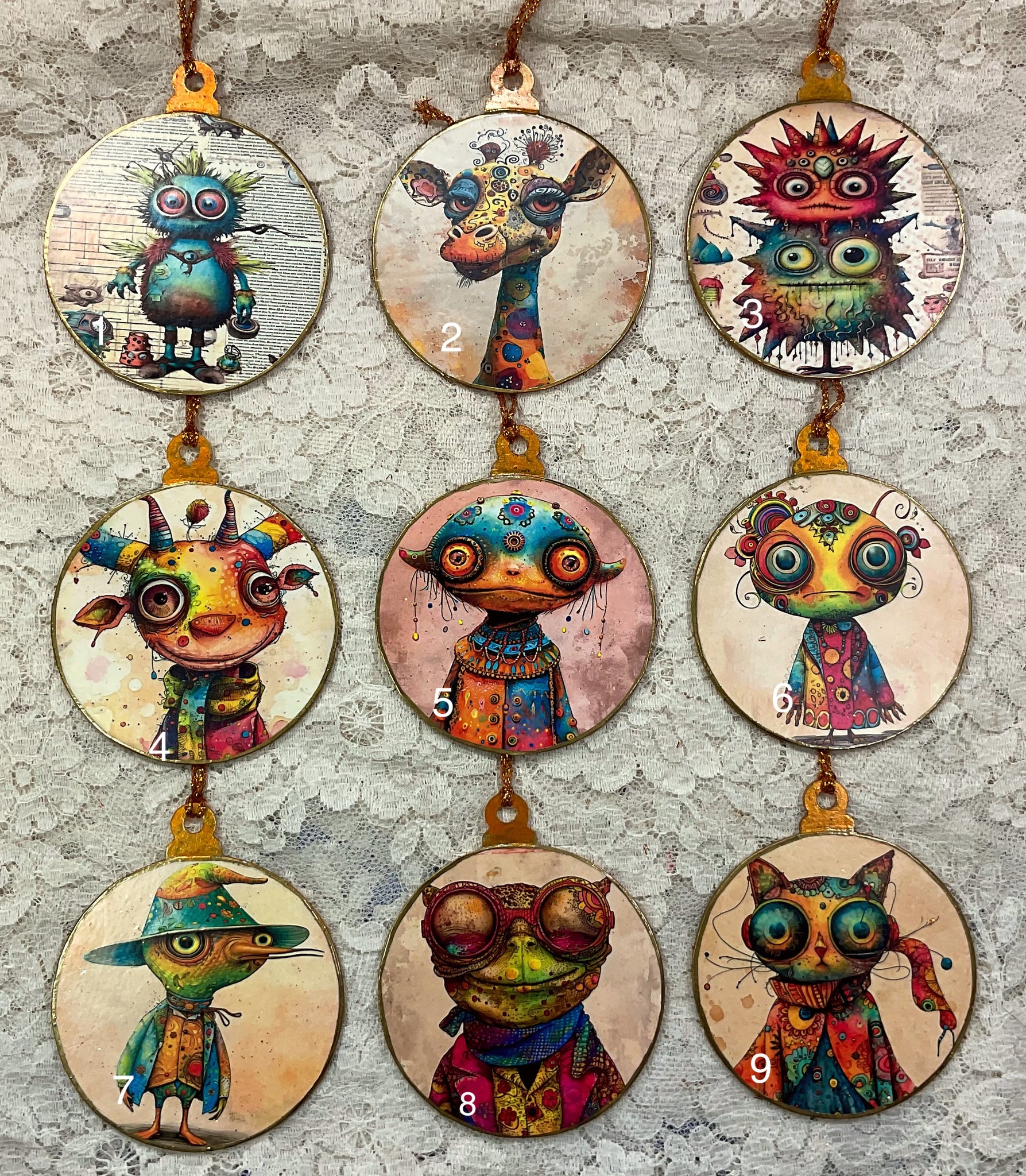 A wonderful assortment of funny funky creatures ornaments to decorate your tree, hang in a window, or give as a gift. The prints are outlined with gold, and have a sparkly antique gold yarn for hanging. Double sided, back paper is a colorful complimentary paper.. For everyone who loves funny creatures!