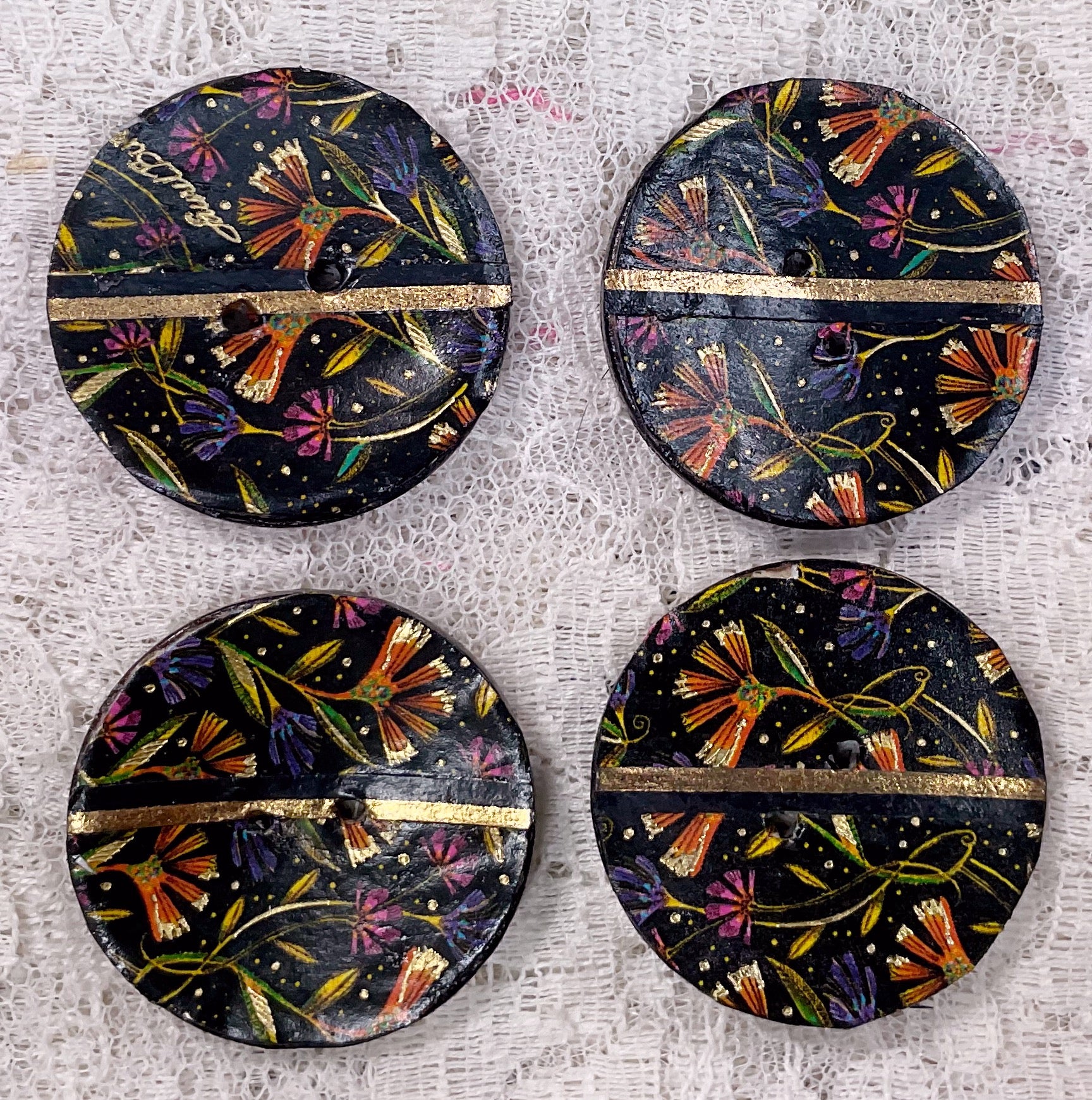 Round Handcrafted coconut buttons, each one created adding a very thin printed paper, then using inks and finished with coats of a clear protection. Buttons apprx 1 and 1/4" in width, and , and 1/8" depth. Each button, while from the same batch, will be unique. I know people have said buttons can be handwashed on a garment, inside out, however I have never felt entirely comfortable while doing. Please note, i am not advising, i feel safer removing, or covering with foi, or plastic wrap with rubber bands. These buttons are embellished with metallic and inks, not sure how washing will work! I would advise handwashing only.