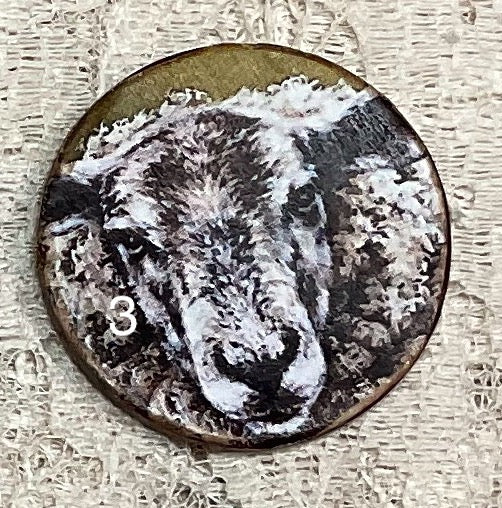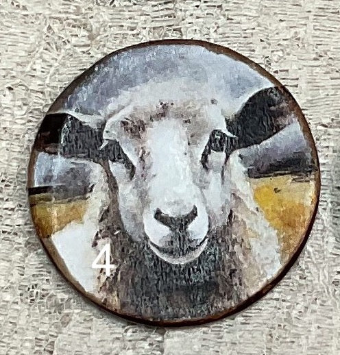 Assorted sheep buttons for all sheep lovers. Round Handcrafted coconut buttons, each one created adding a very thin printed paper, then sometimes using inks, and metallics, and finished with multiple coats of acrylic. The grain from coconut gives the buttons a leatherlike distressed look.