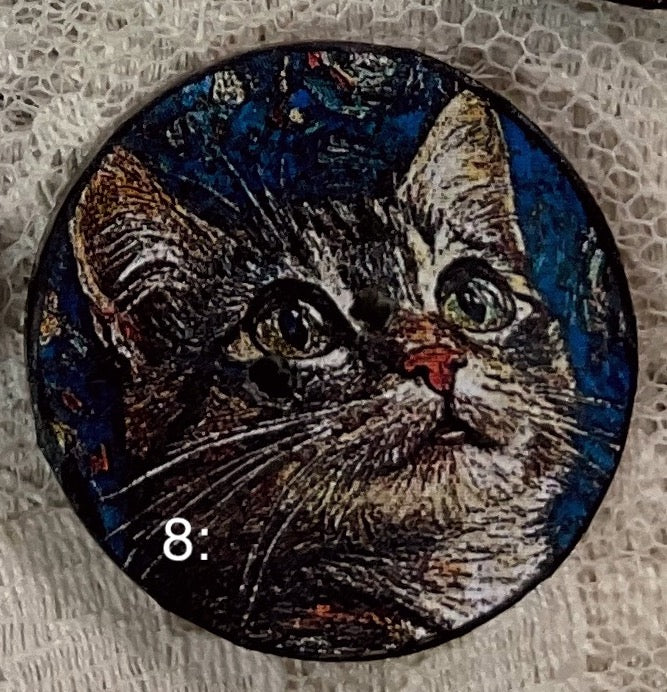 Price is per button. Round coconut buttons, each one created adding a very thin printed paper, then using inks and finished with coats of a clear protection. Buttons apprx 1 and 1/4" in width, and , and 1/8" depth. Each button, while from the same batch, will be unique. I know people have said buttons can be handwashed on a garment, inside out, however I have never felt entirely comfortable while doing.Suggestions: cover with plastic wrap and rubber bands when washing.