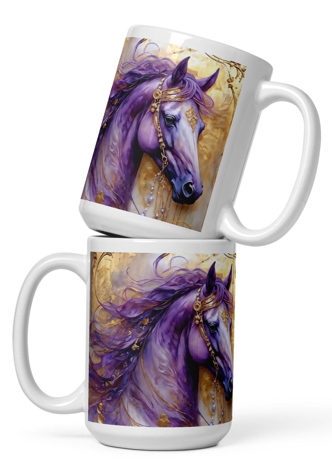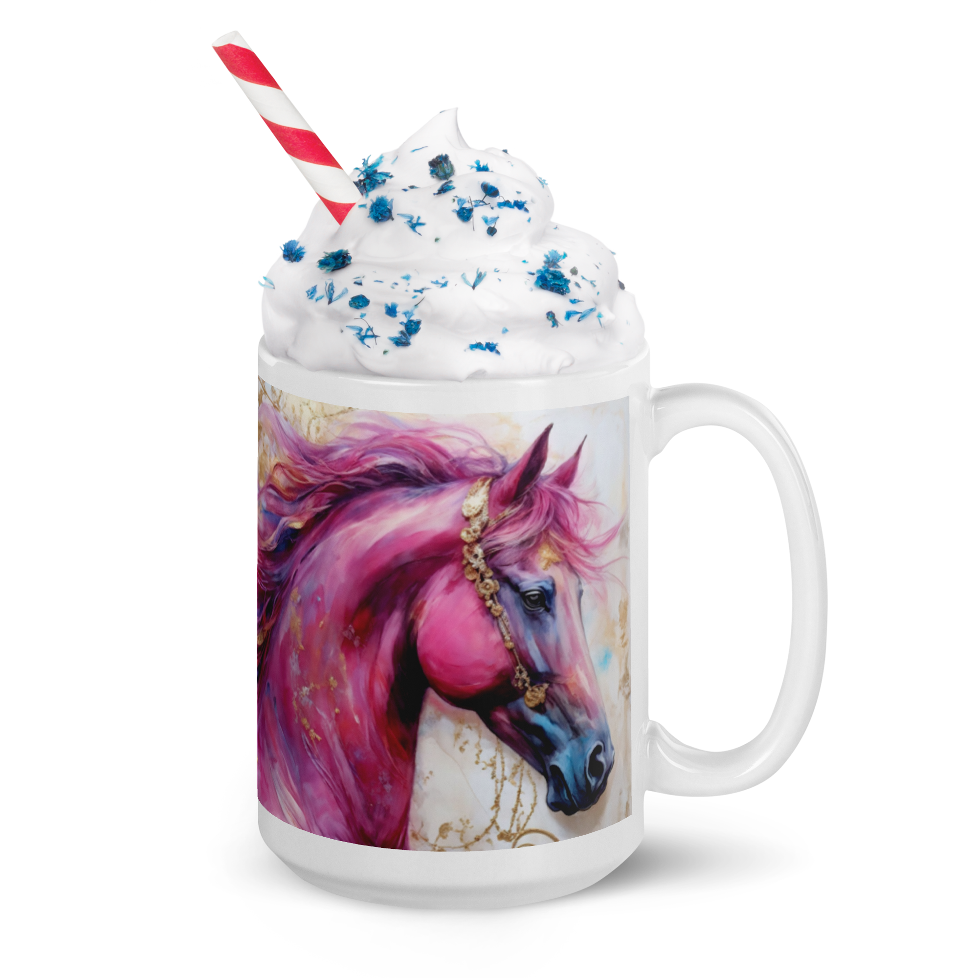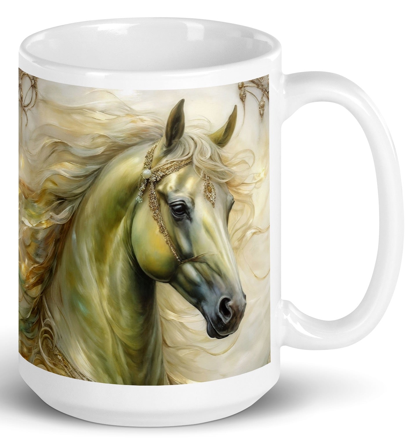 A wonderful way to start your day with a Colorful Horse print of your choice on this 15 oz mug. Whether you're drinking your morning coffee, evening tea, or something in between—this mug's for you! It's sturdy and glossy with a vivid print that'll withstand the microwave and dishwasher.