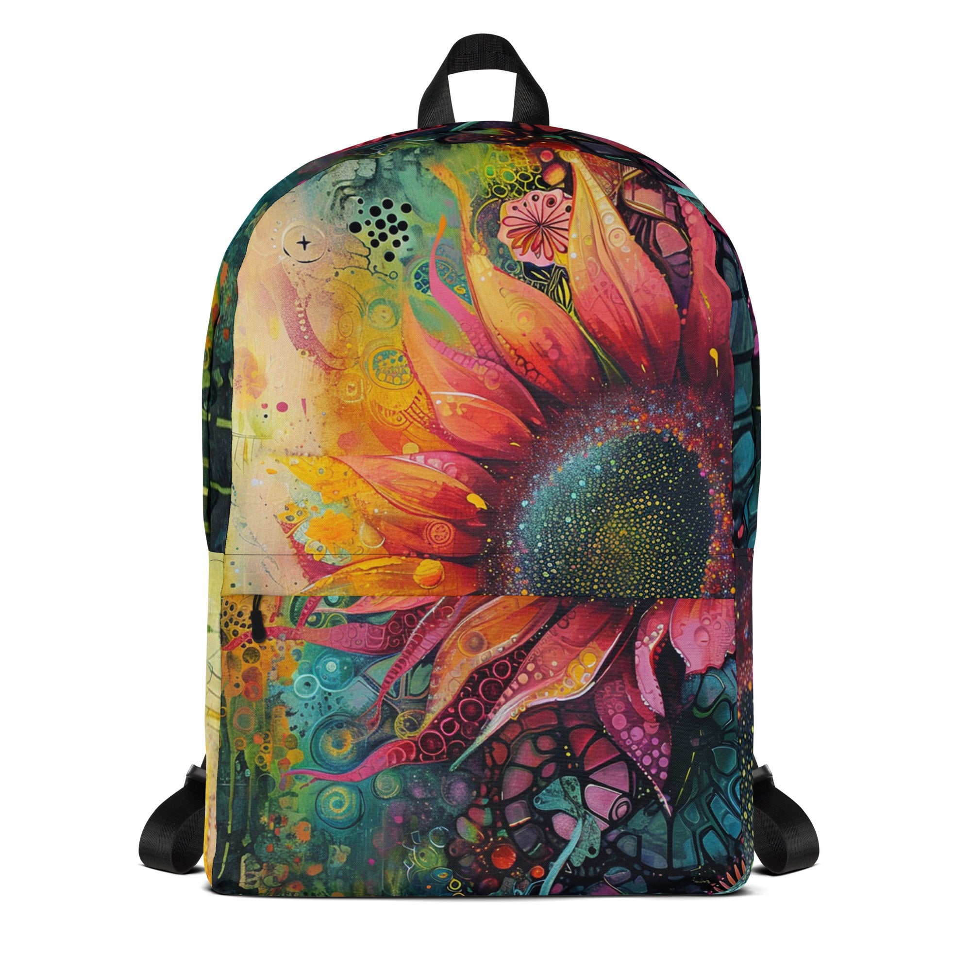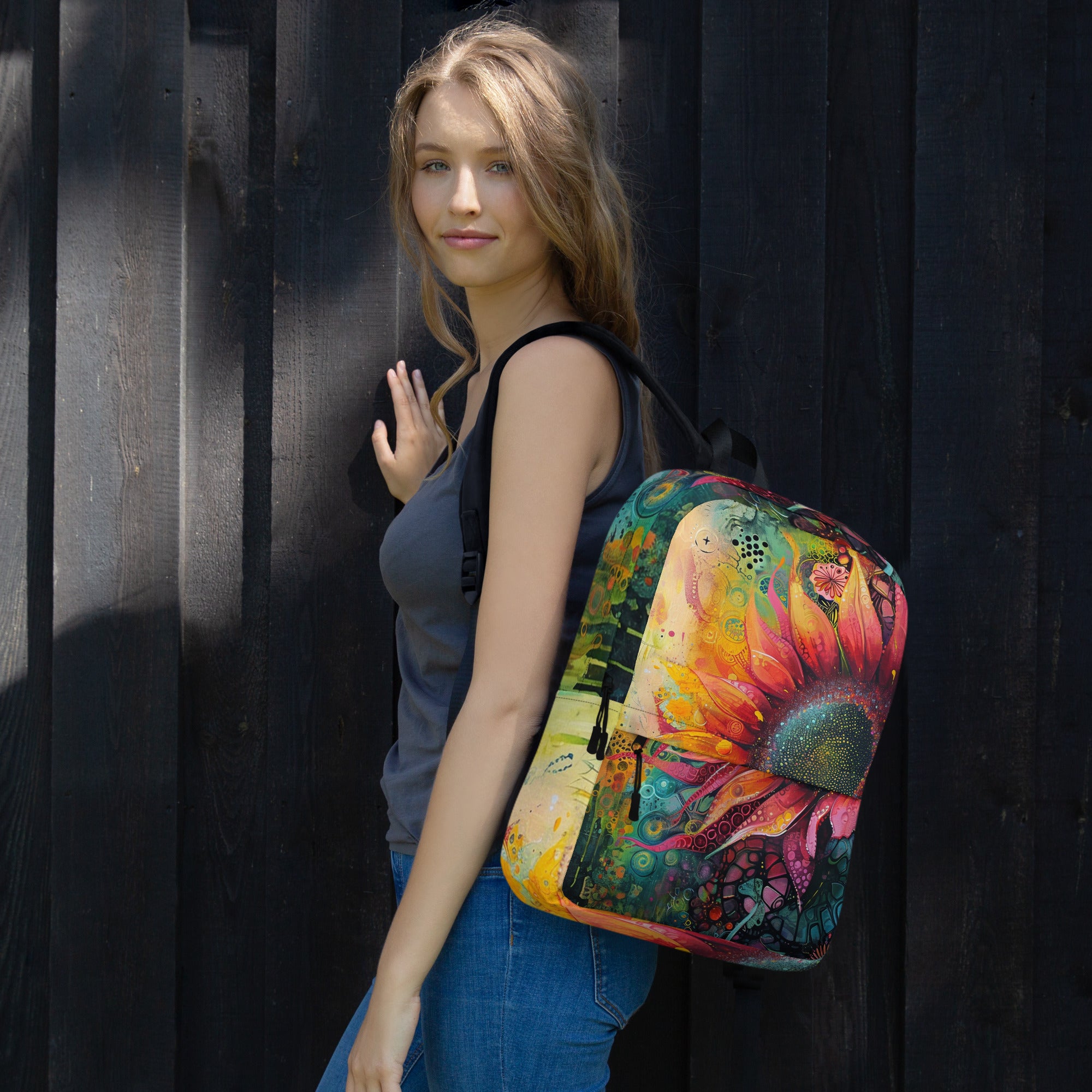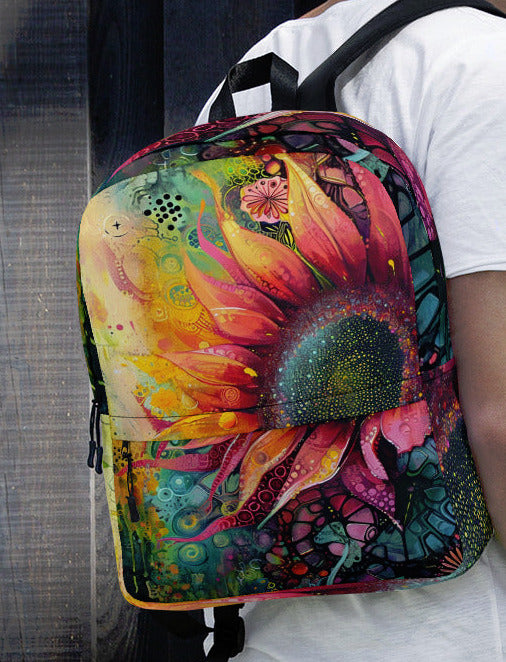 This medium size backpack with a vibrant sunflower print is sure to make a statement! Itis just what you need for daily use or sports activities! The pockets (including one for your laptop) give plenty of room for all your necessities, while the water-resistant material will protect them from the weather.