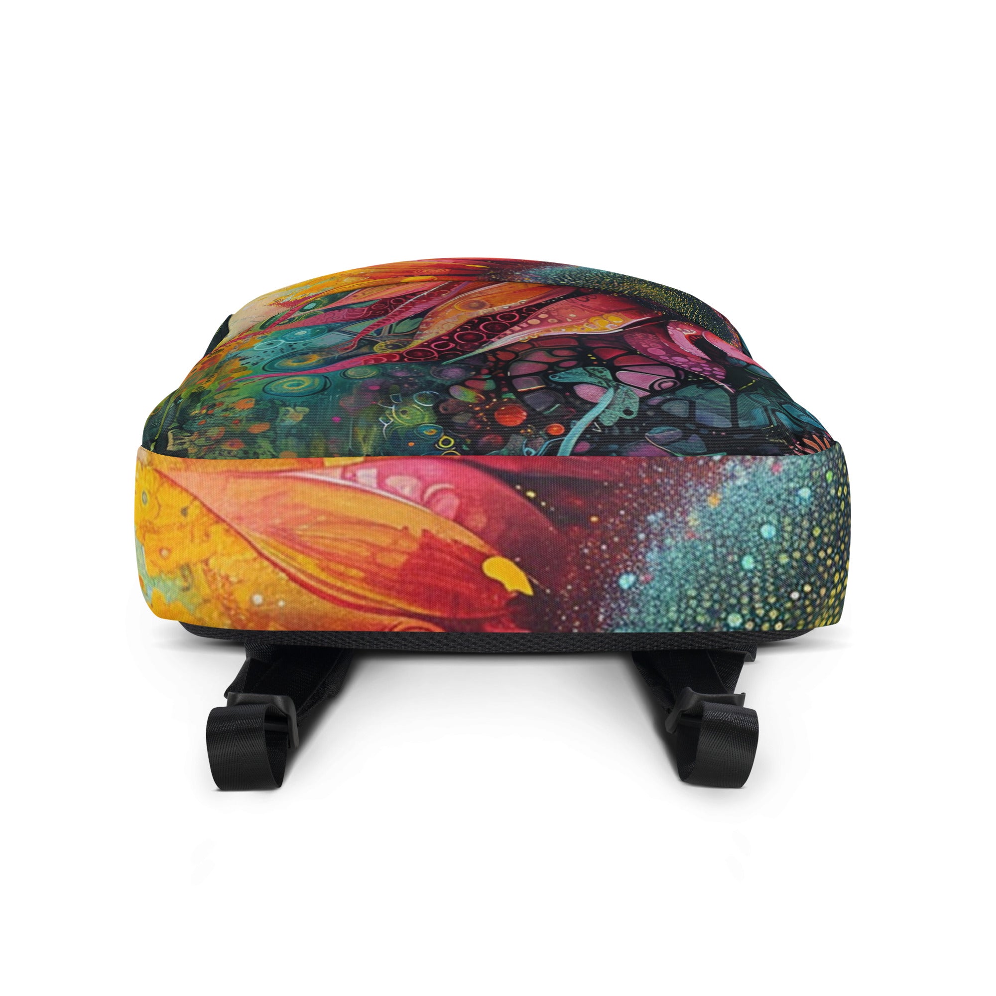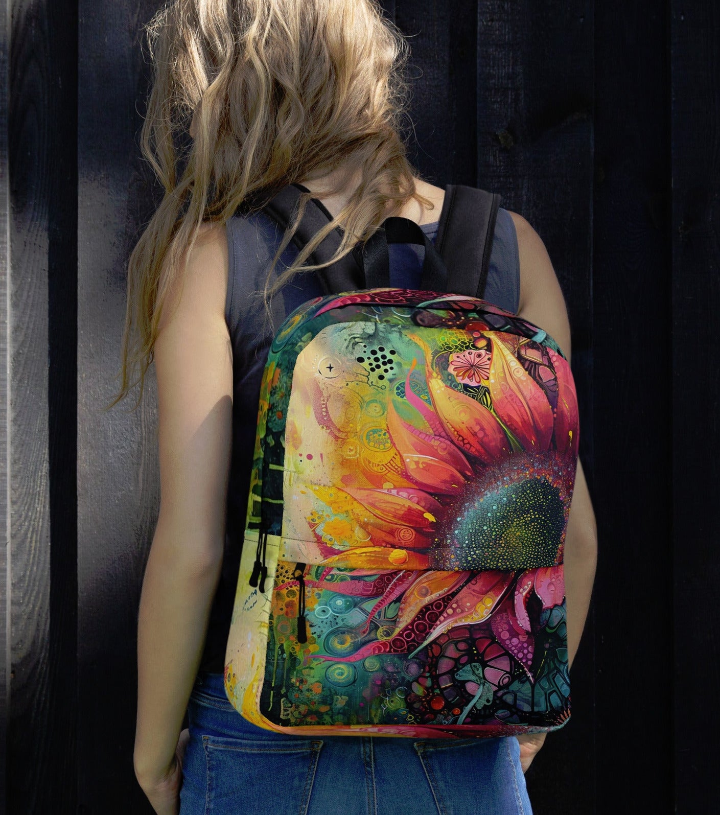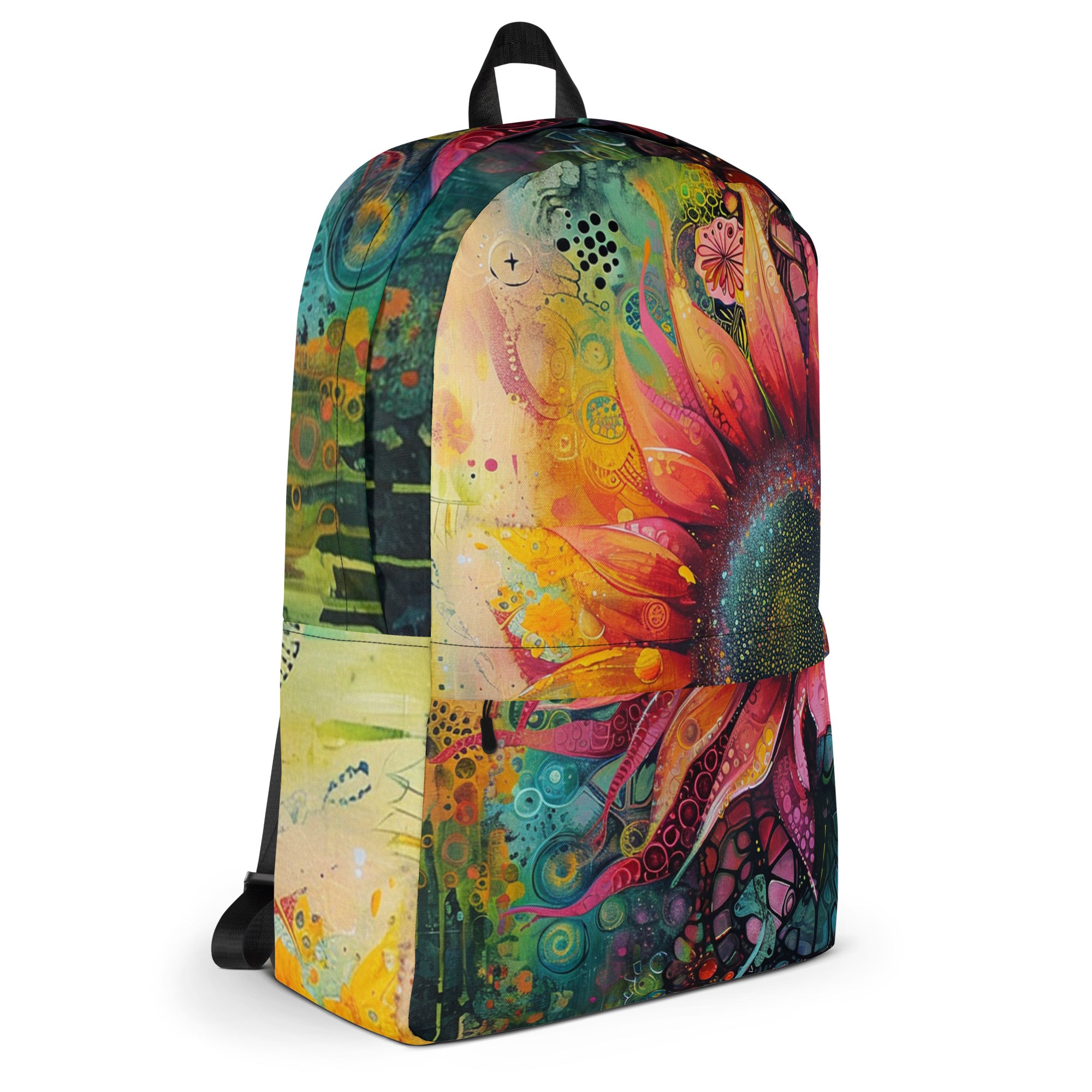 This medium size backpack with a vibrant sunflower print is sure to make a statement! Itis just what you need for daily use or sports activities! The pockets (including one for your laptop) give plenty of room for all your necessities, while the water-resistant material will protect them from the weather.