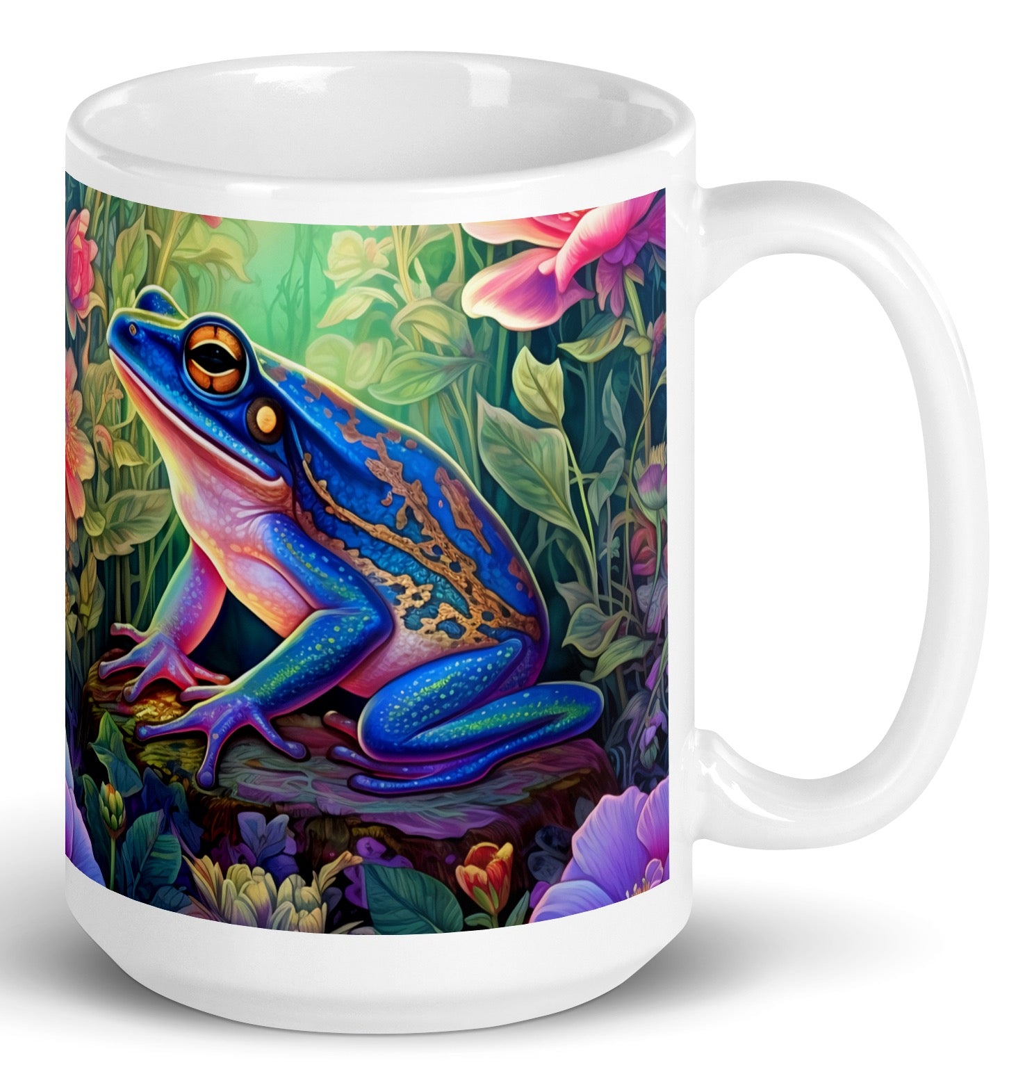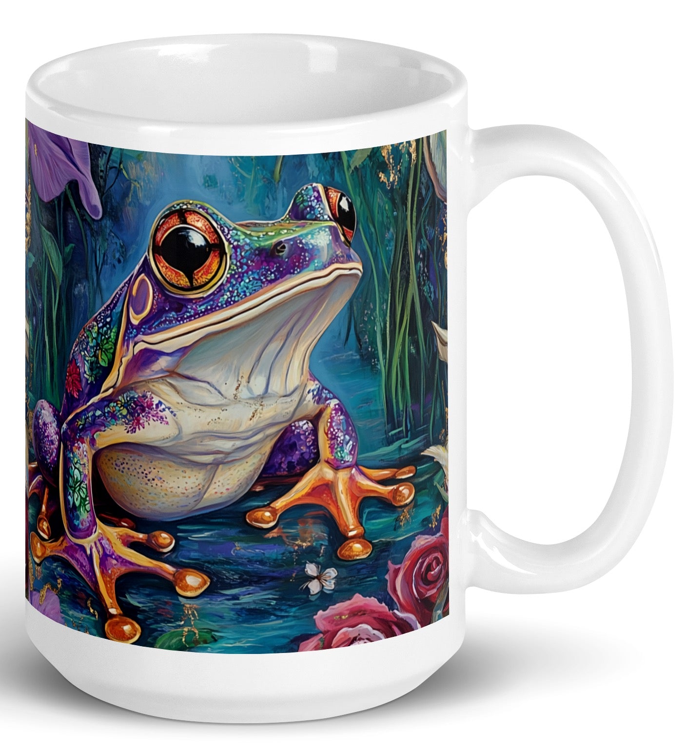 A wonderful way to start your day with a colorful charming frog print of your choice on this 15 oz mug. Whether you're drinking your morning coffee, evening tea, or something in between—this mug's for you! It's sturdy and glossy with a vivid print that'll withstand the microwave and dishwasher.