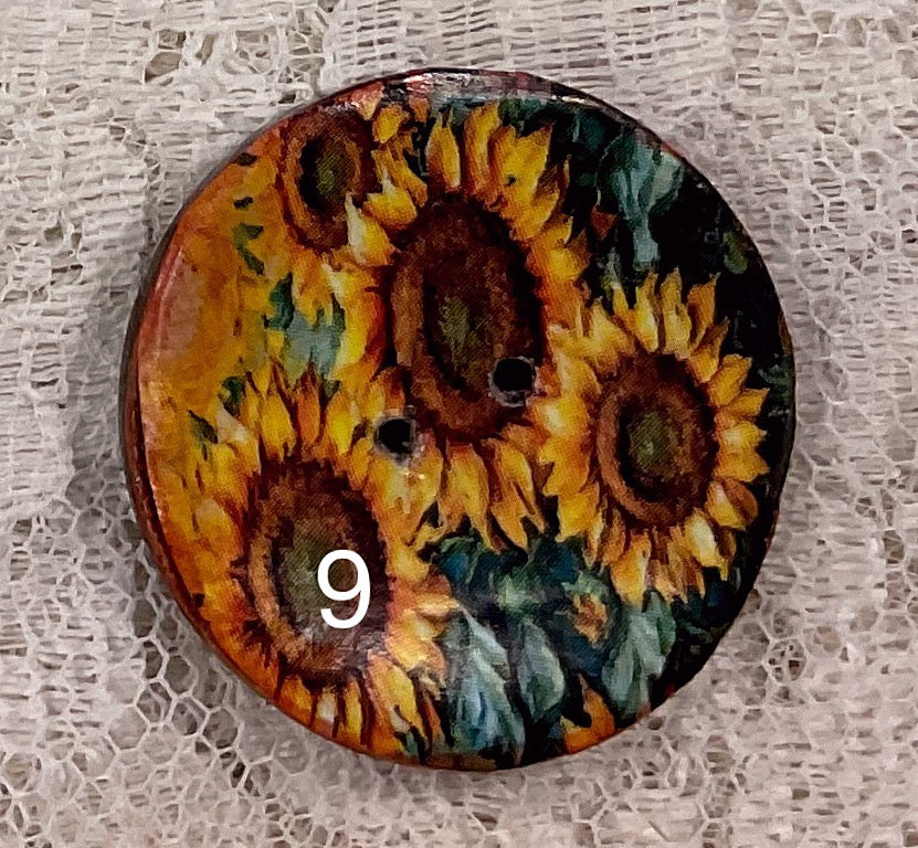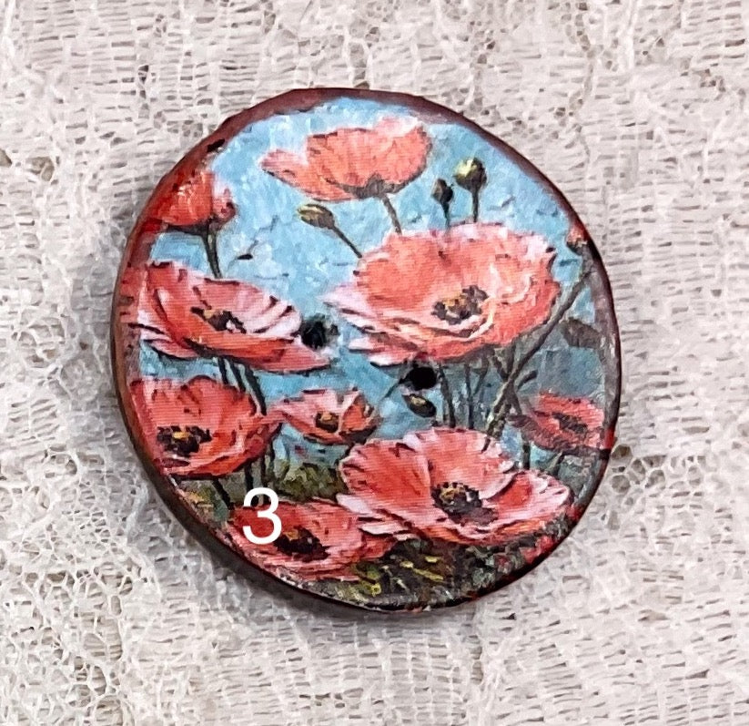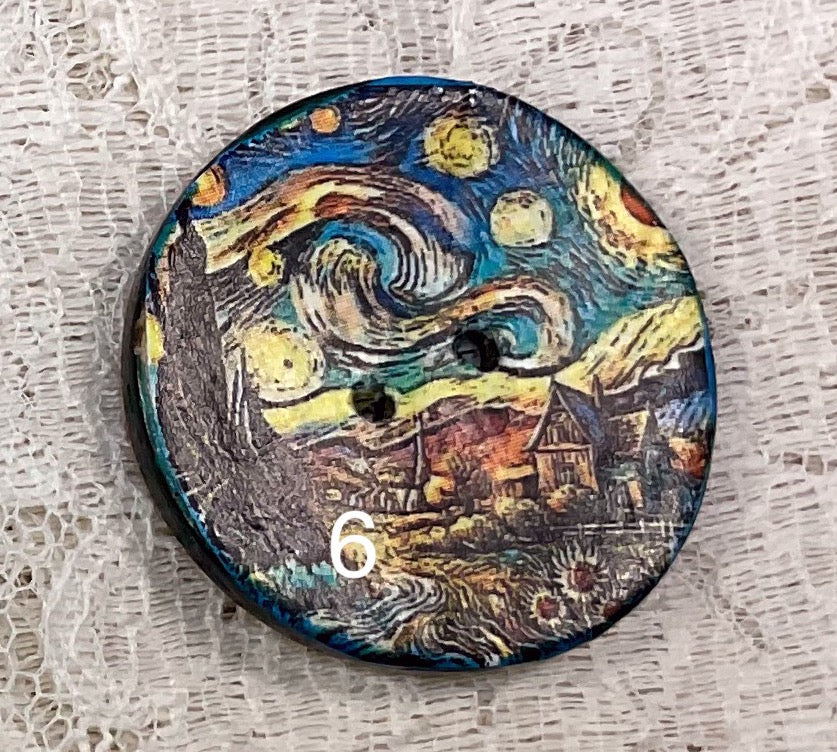 Round coconut buttons, each one created adding a very thin printed paper, then using inks and finished with coats of a clear protection. Buttons apprx 1 and 1/4" in width, and , and 1/8" depth. Each button, while from the same batch, will be unique. I know people have said buttons can be handwashed on a garment, inside out, however I have never felt entirely comfortable while doing. Please note, i am not advising, i feel safer removing, or covering with foil. Some buttons are embellished with metallic and inks, not sure how washing will work! I would advise against washing.😊